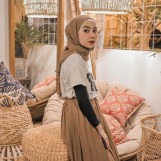Nah, untuk kamu yang suka dengan gaya yang lebih santai, kamu bisa coba look yang satu ini. Pakailah hijab dan rok plisket dengan warna mocca yang senada. Lalu, jangan lupa pakai inner berwarna hitam, dan kenakan kaos yang tidak pas dengan badan, lebih baik warna putih. Agar menunjang gaya yang kasual dan kekinian, chunky sneakers akan membuatmu semakin cool.