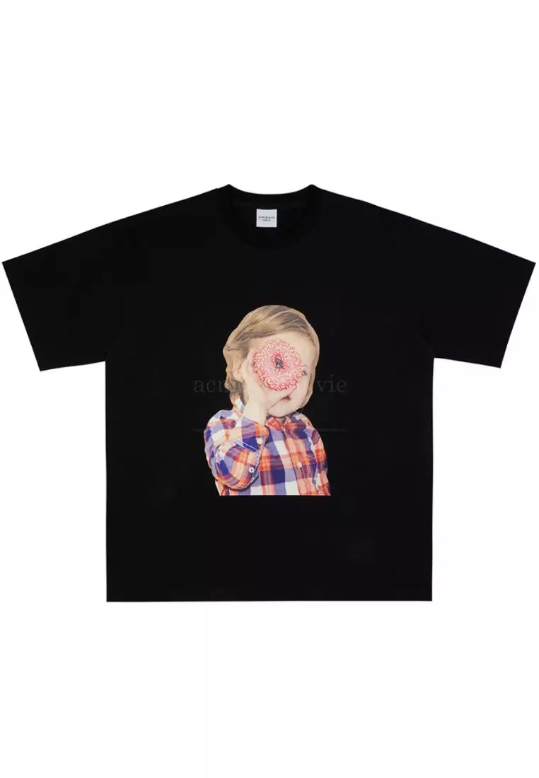 Baby Face Checked Shirt Donut Short Sleeve T-Shirt Black