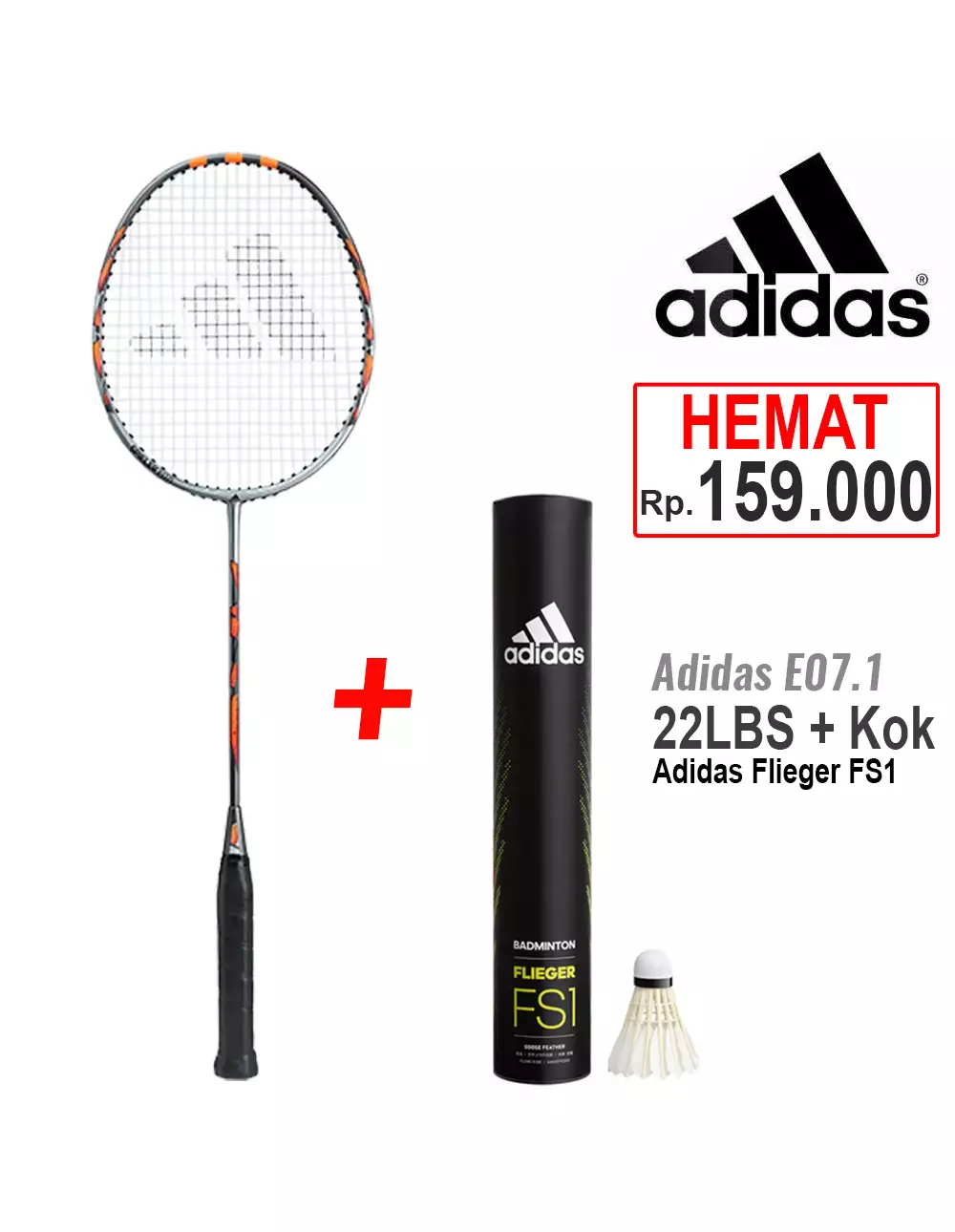 Adidas BadmintonPaket Raket Badminton Adidas E07.1 dan Shuttlecock Flieger FS1 Speed 77 Putih isi 12449000.00