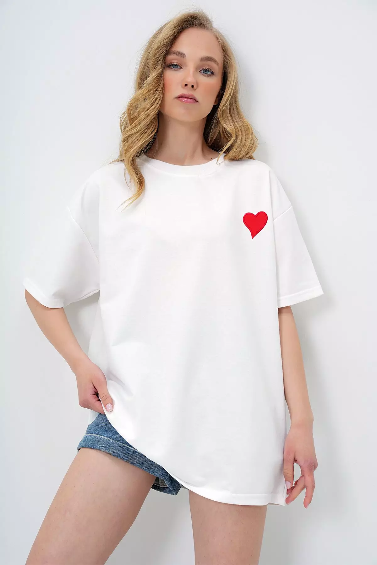 Women's White Crew Neck Heart Embroidered Two Thread Oversize T-Shirt Alc-X13912
