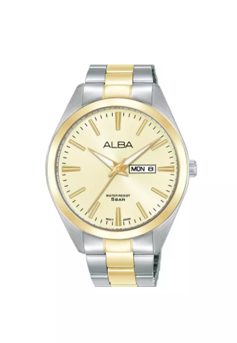 Jam Tangan Pria Alba AJ6204 AJ6204X1 Strap Stainless Steel Dual Tone Color Men Gold Dial Original Garansi Resmi