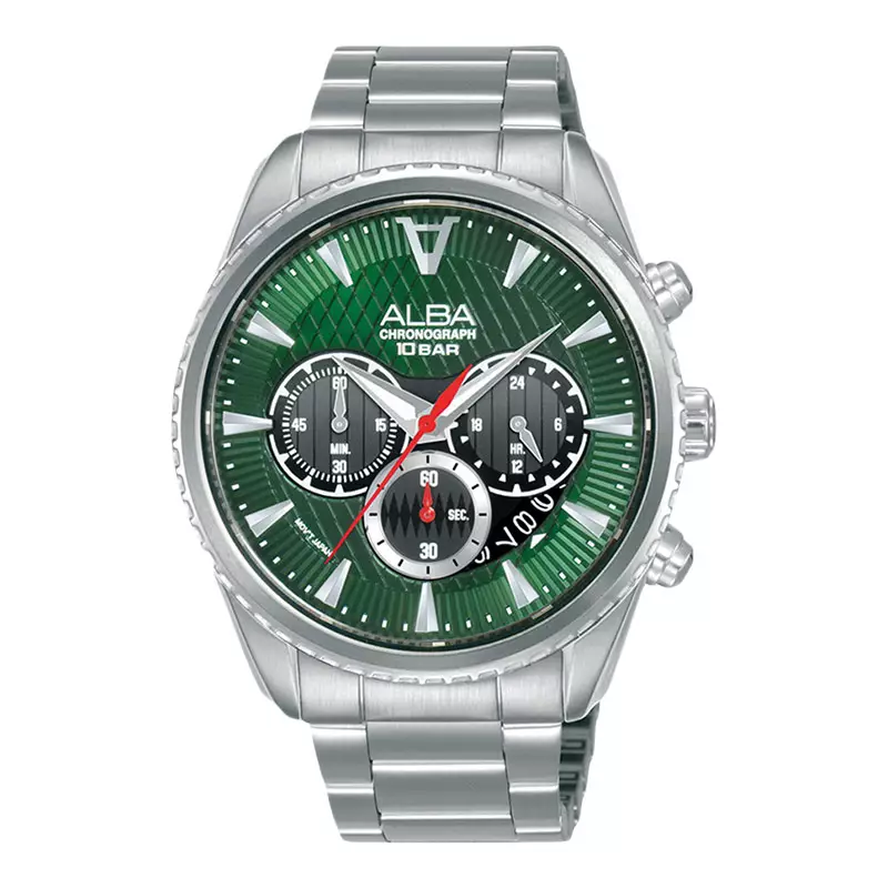 Jam Tangan Pria Alba Signa AT3J13X1 Chronograph Men Green Dark Grey Gradation Patterned Dial Stainless Steel Strap
