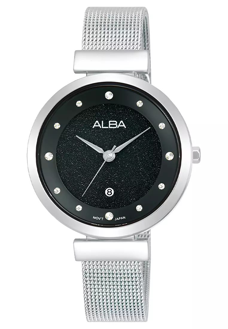 Jam Tangan Wanita Alba AH7CA5X1 Black Patterned Dial Mesh Bracelet - Stainless Steel