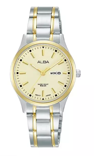 Jam Tangan Wanita Alba Prestige AN8056 AN8056X1 Strap Stainless Steel Silver Gold Color Analog Beige Dial Dual Tone Color