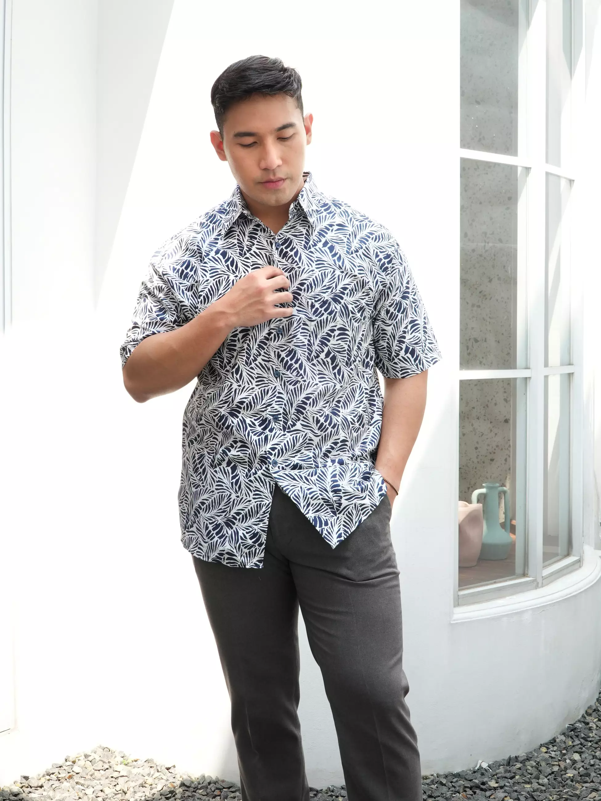 Kemeja Lengan Pendek Putih Navy Motif Daun 16846