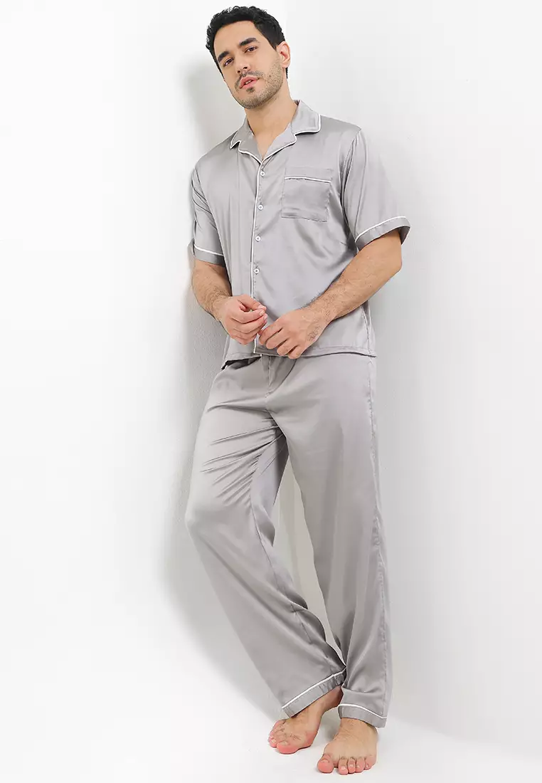 Pyjama Pijama Baju Tidur Satin Silk Short Sleeve Long Pants Berkantong Mens Pria Sleepwear