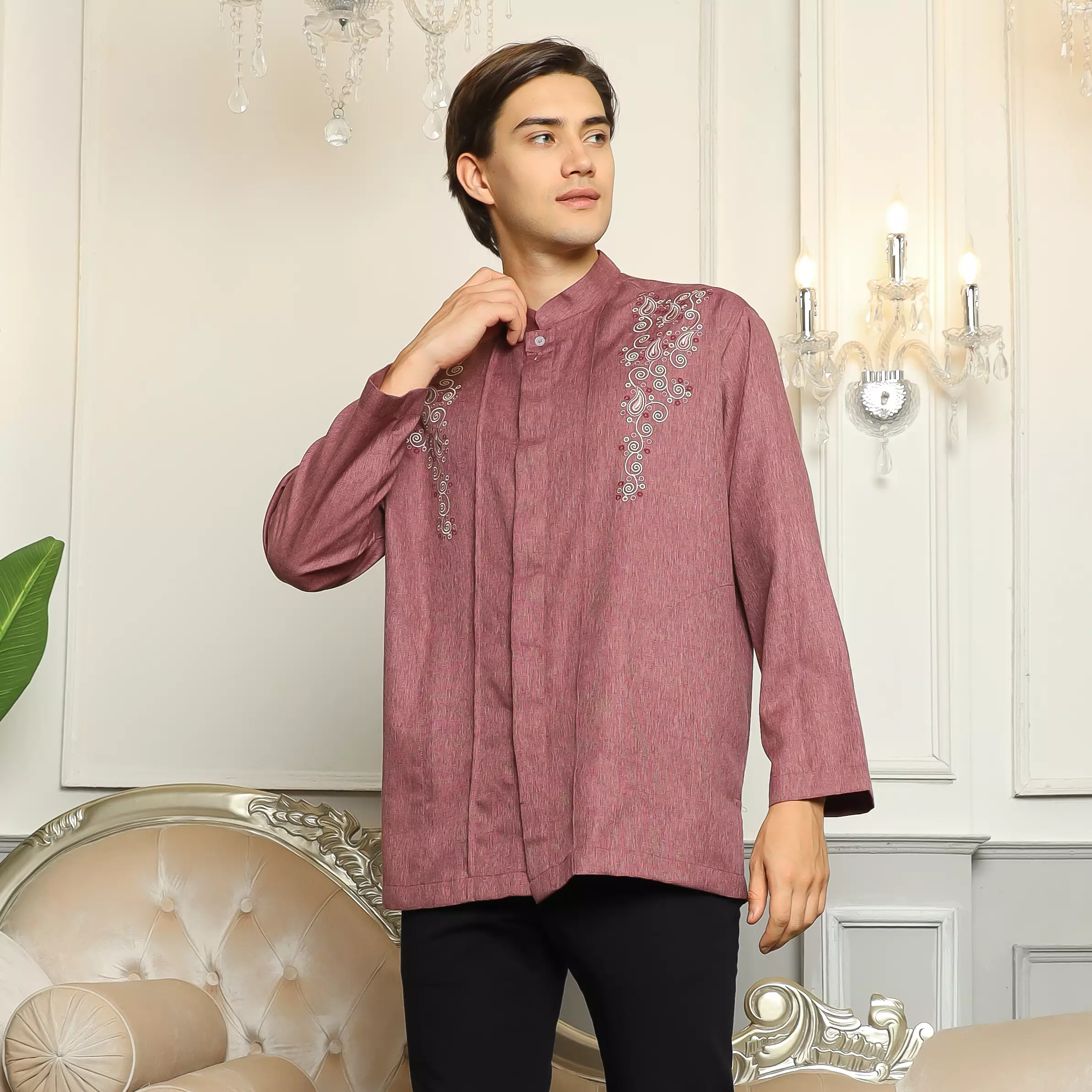 - Leher: Kerah Mandarin
