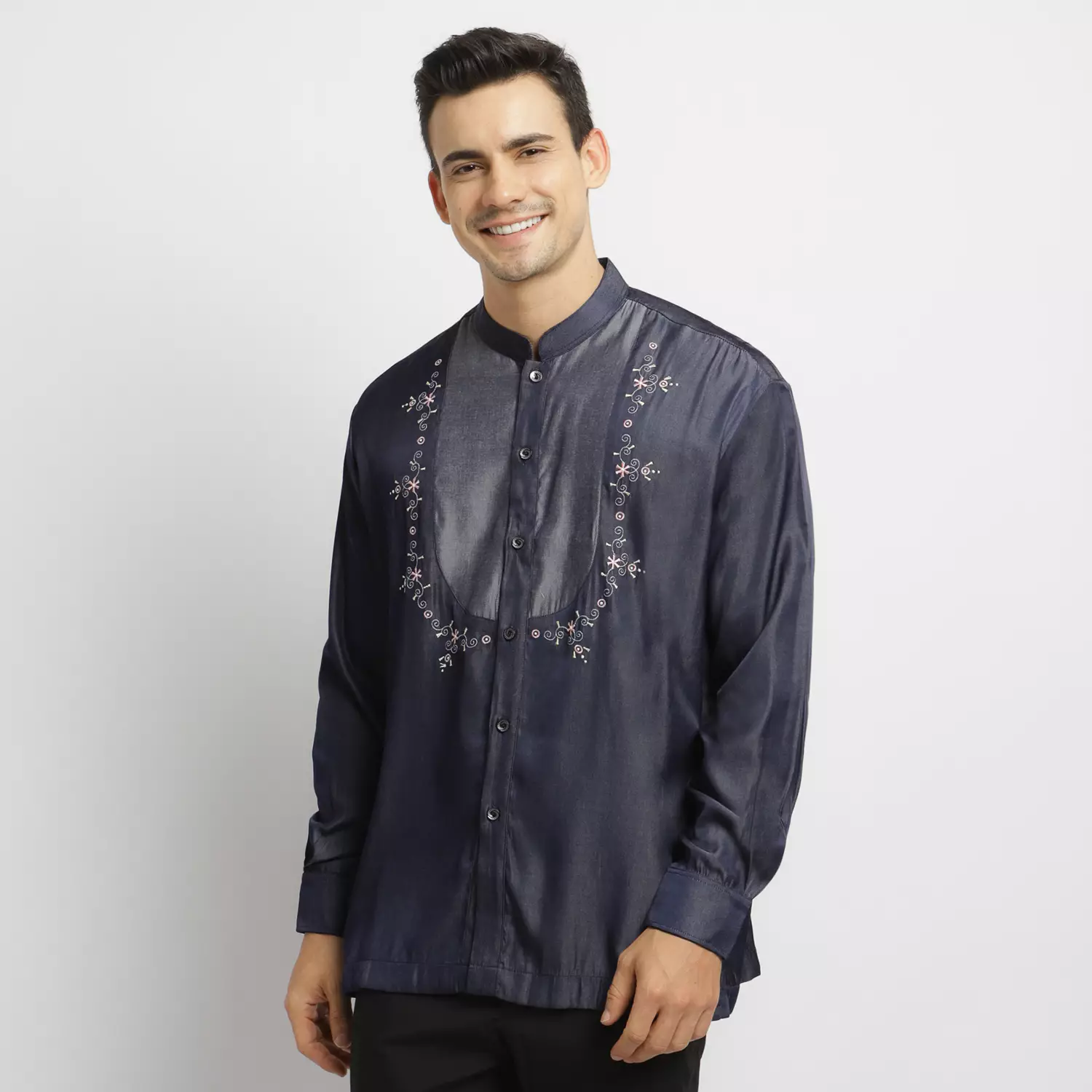 - Leher: Kerah Mandarin