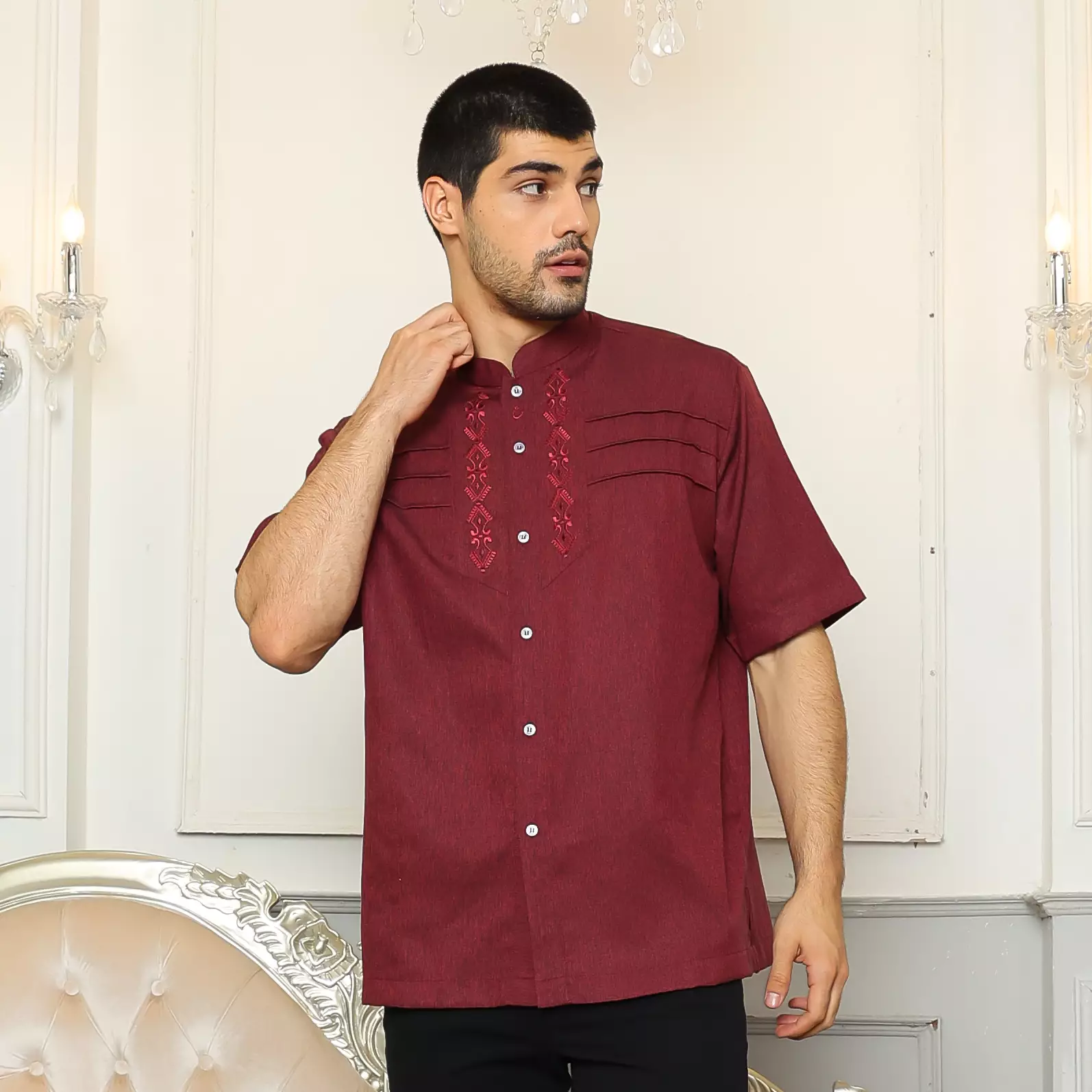 - Leher: Kerah Mandarin