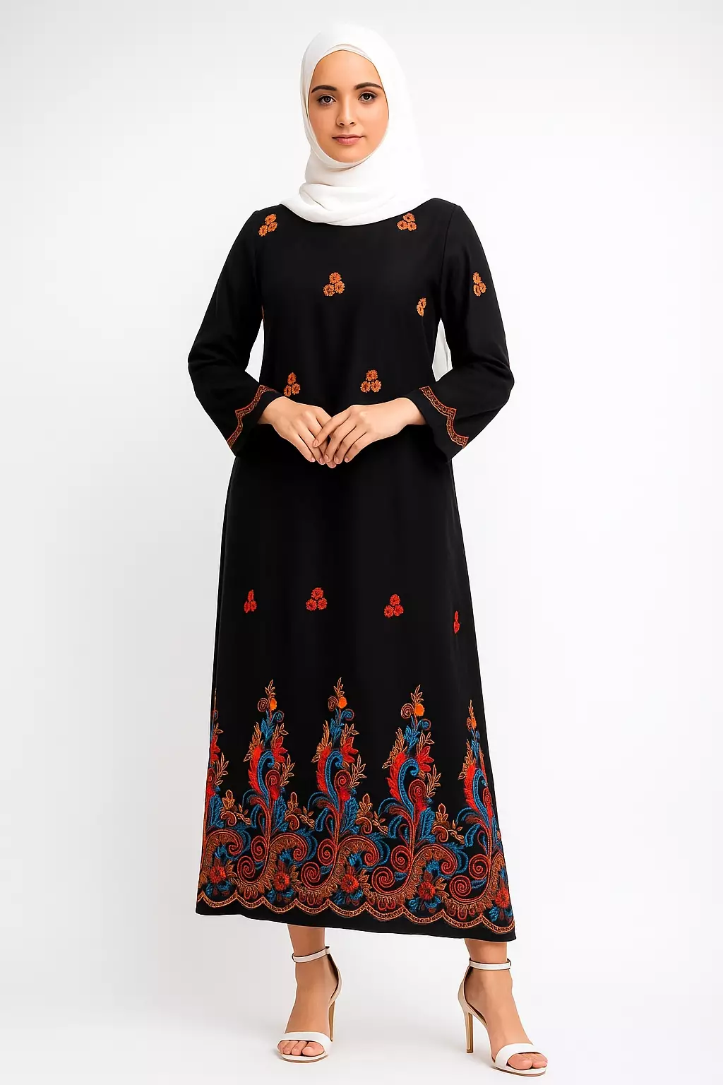 Zahra Maxi Dress In Black With Orange Blue Embro