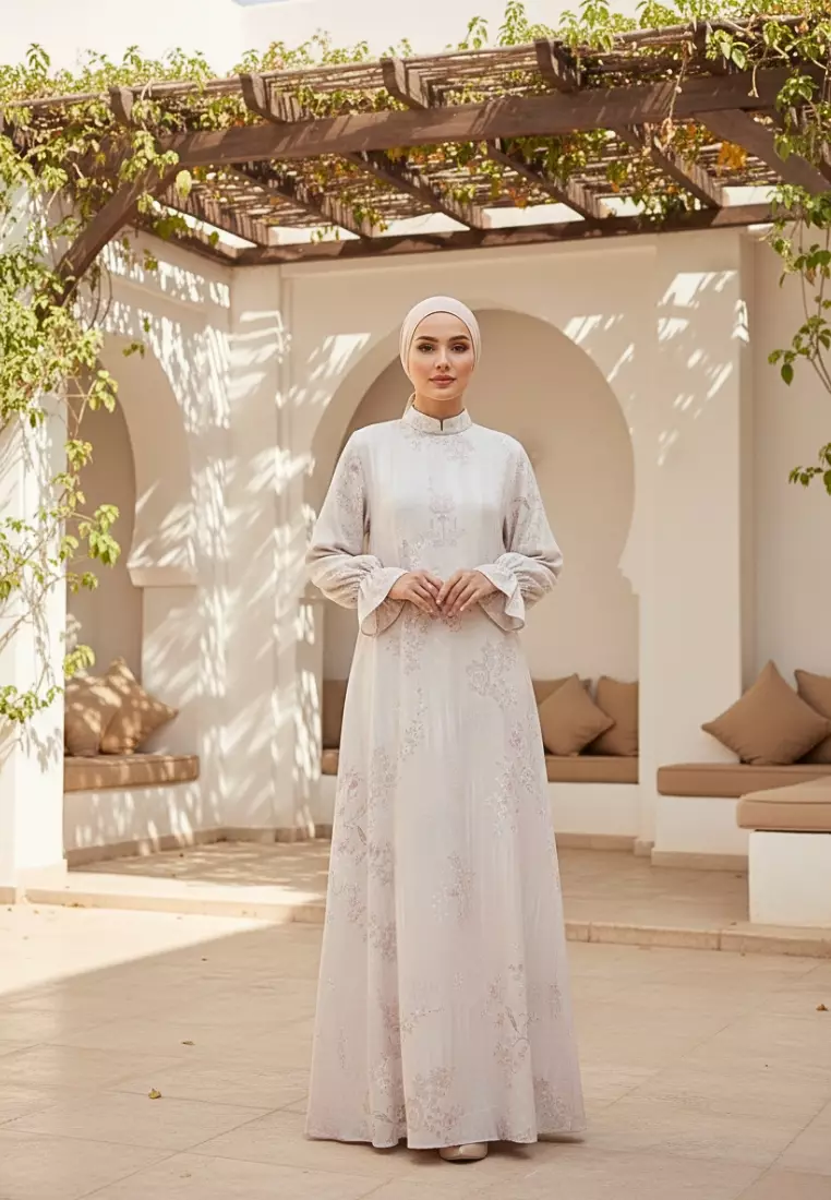 Gamis Lebaran Terbaru Mosleem Kekinian Lengan Karet Motif Pastel By Brilliant Girl Warna CREAM