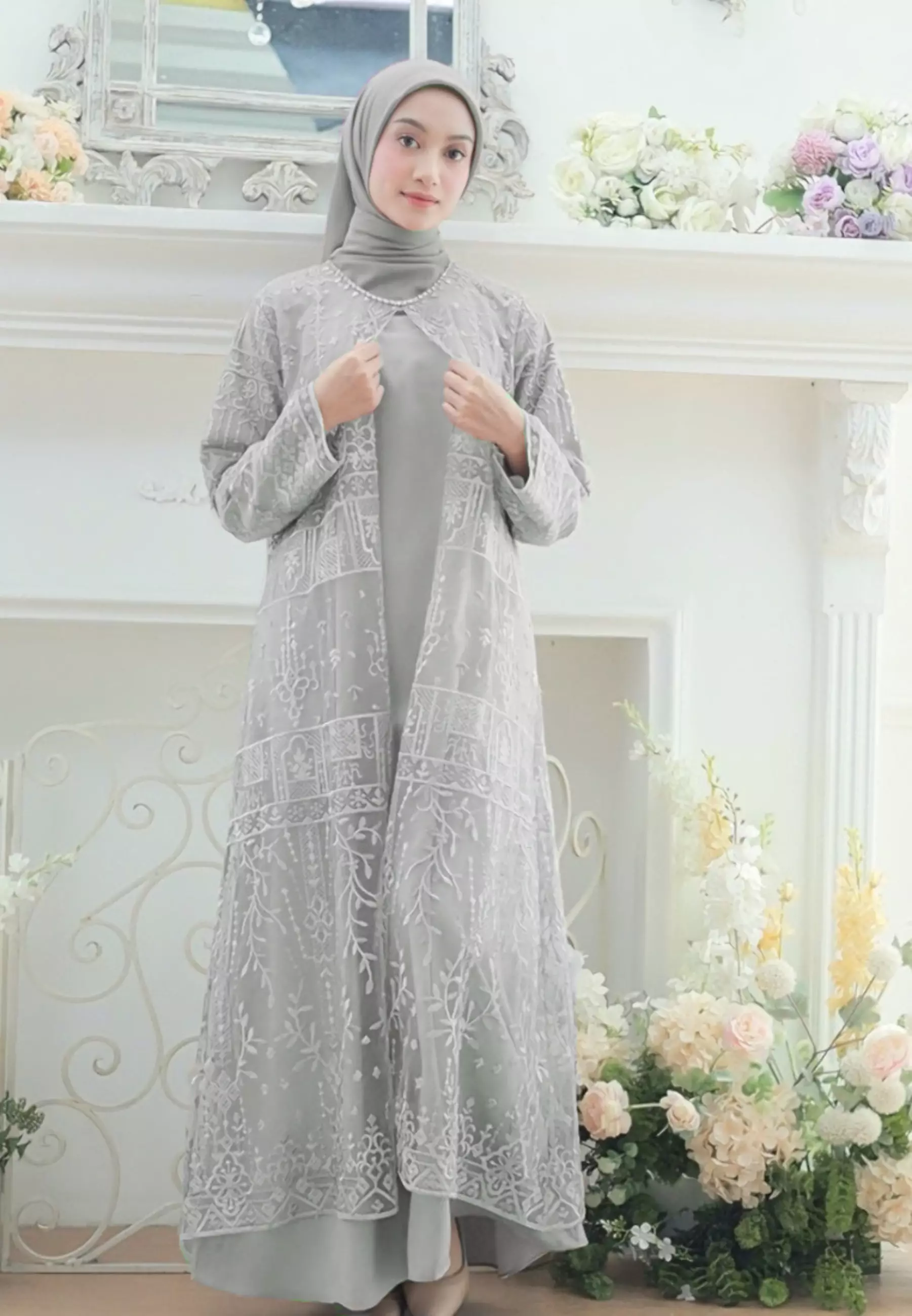 Brilliant GirlMosleem Long Dress Broakat With Pearl Detail in Sage Green By Brilliant Girl Warna Sage1349000.00607050.00