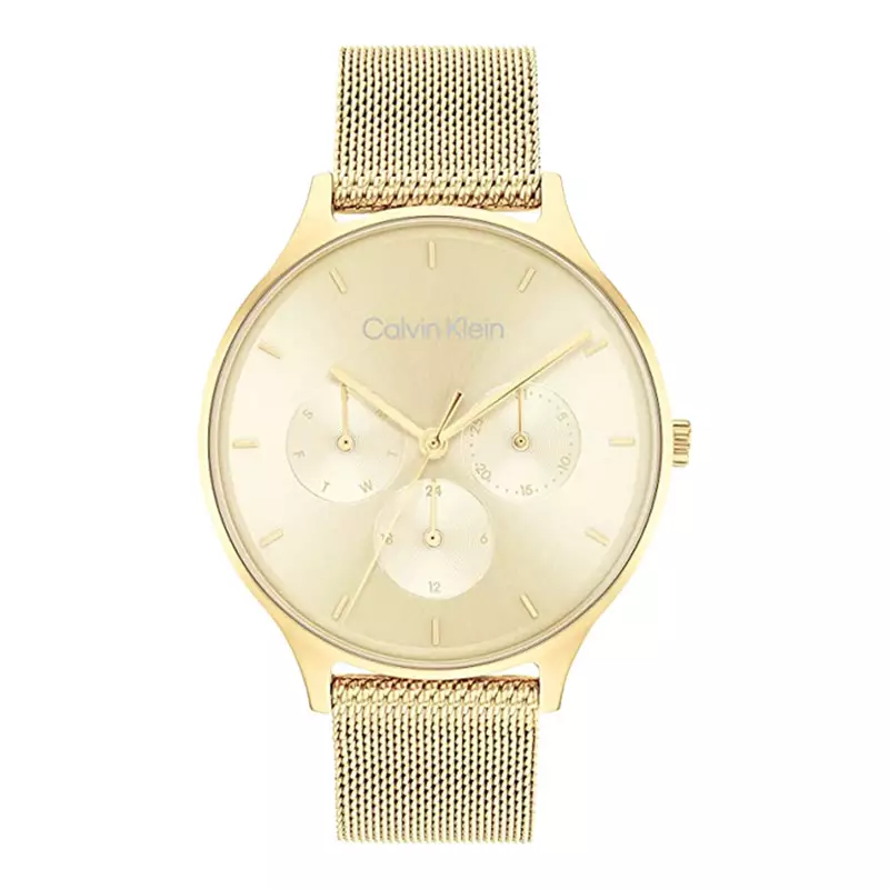 Jam Tangan Wanita Calvin Klein Timeless Multifunction 25200103 Ladies Gold Dial Gold Mesh Strap