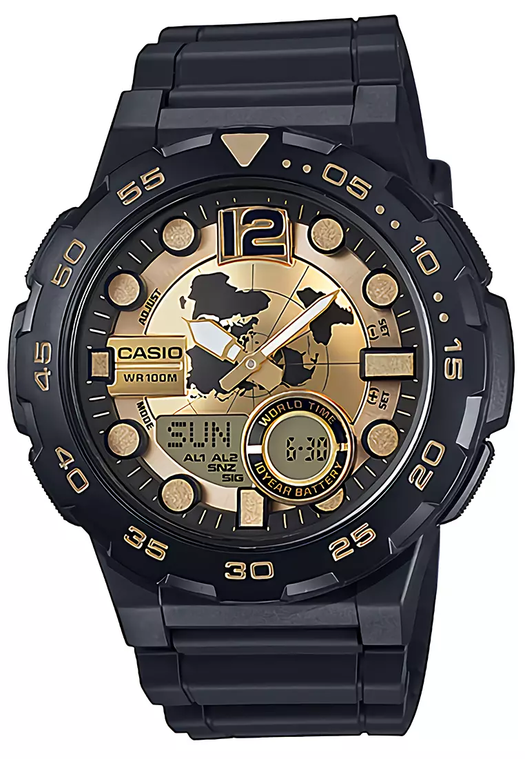 Casio World Time - Jam Tangan Pria - Black Gold - Resin Strap - AEQ-100BW-9AVDF