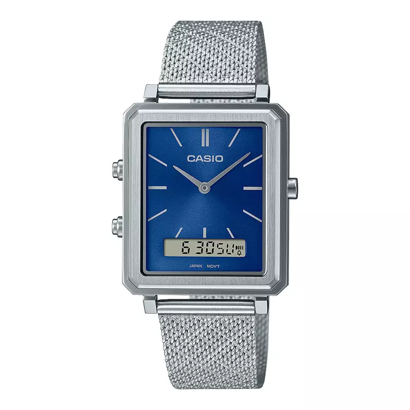 Jam Tangan Pria Casio General MTP-B205M-2EDF Men Blue Digital Analog Dial Silver Mesh Band