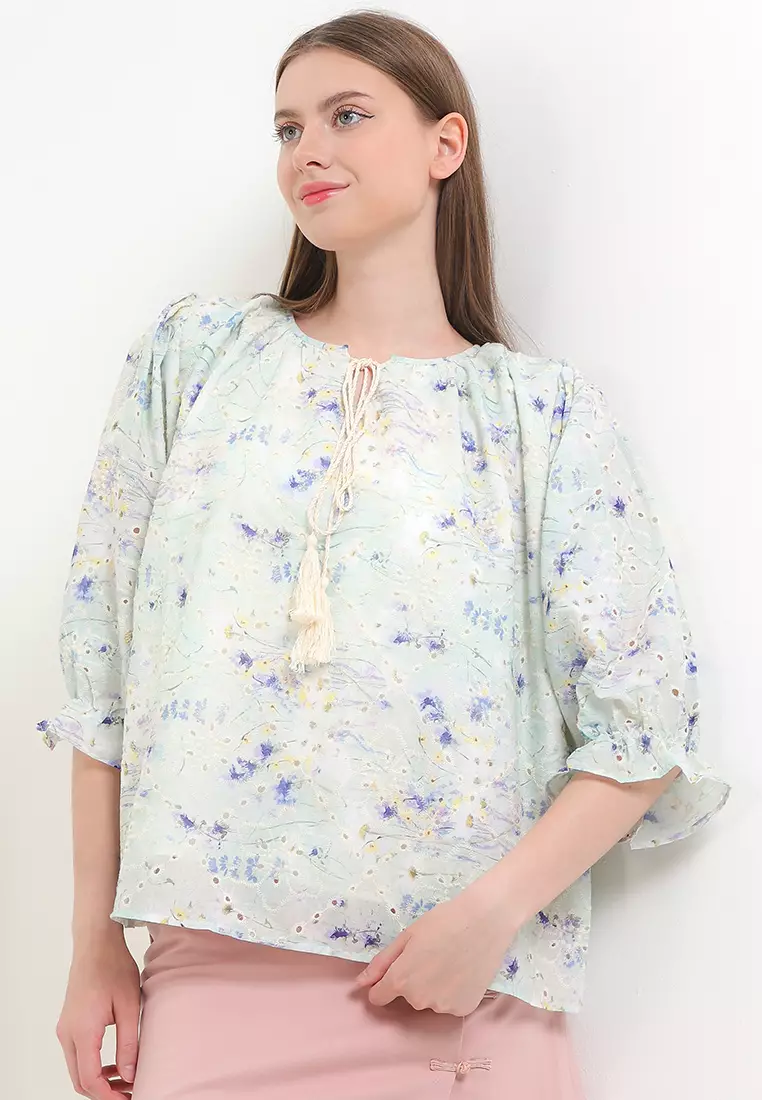 Chic Simple3/4 Ruffles Sleeves Flo Print Eyelet Emb Blouse W/ Tassels395000.00