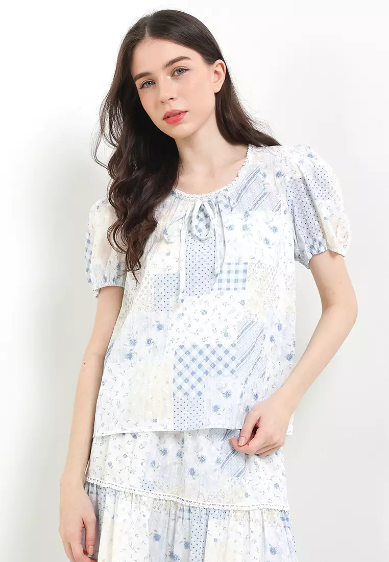 Puff Sleeves Flo Patches Print Lace Trimed Blouse W/ Ribbon