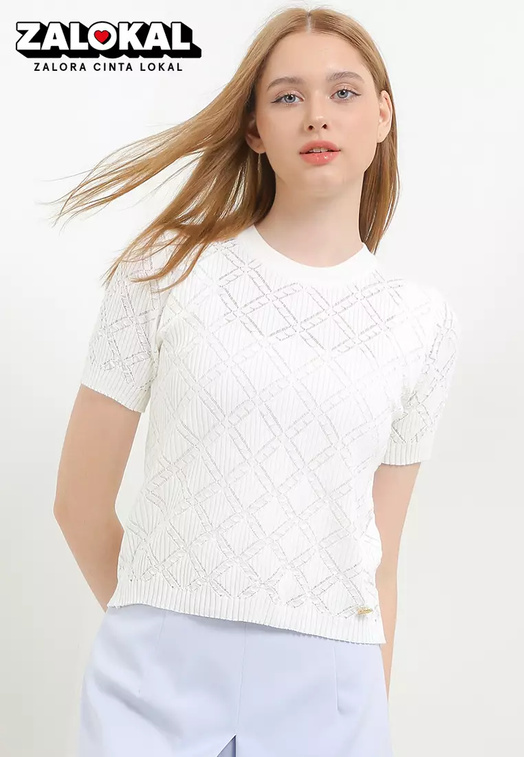 S/S High Neck Knit Blouse W/ Rose Emblem