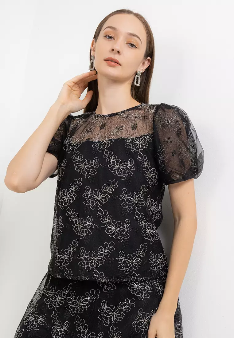Chic SimpleTulle Detail Puff Sleeve Pekaboo Emb Mesh Blouse395000.00