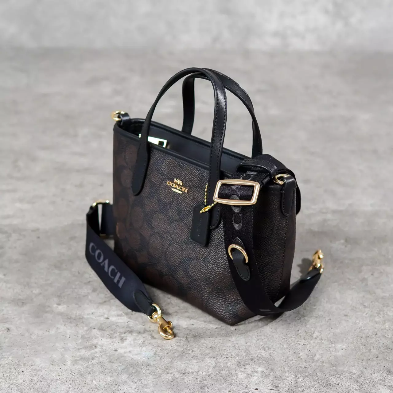 Tas COACH CITY MONOGRAM BLACK DARK BROWN MINI ZIP TOTE BAG WITH LS 100% ORIGINAL