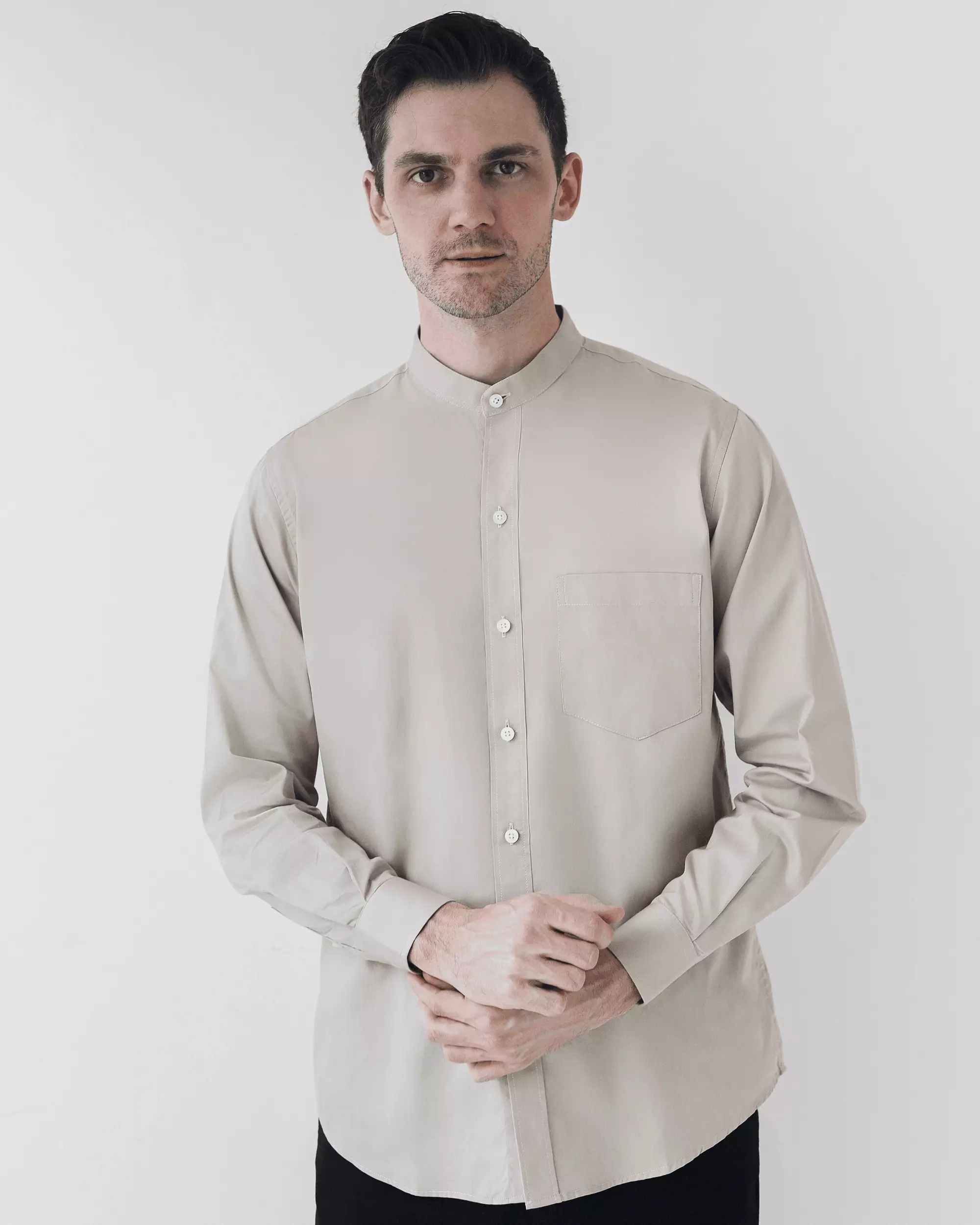 Cotton Well Badr Stand Collar Shirt Light Taupe | Kemeja Koko Lengan Panjang Krem
