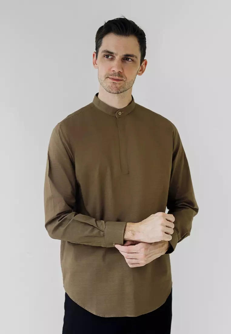 Cotton Well Oman Henley Shirt Olive Brown │Kemeja Koko Basic Lengan Panjang Hijau Coklat