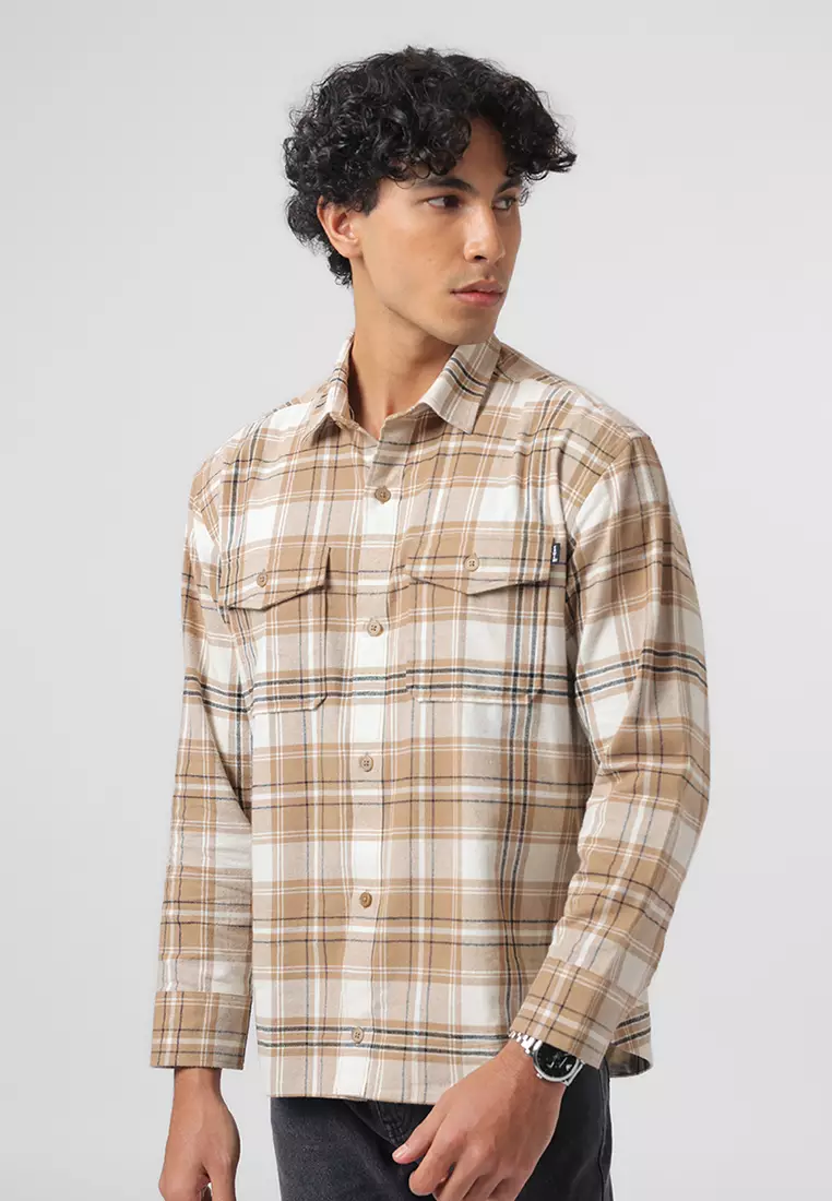 MELVINS - BEIGE Kemeja Flannel Pria Motif Kotak-Kotak Lengan Panjang Relaxed Fit