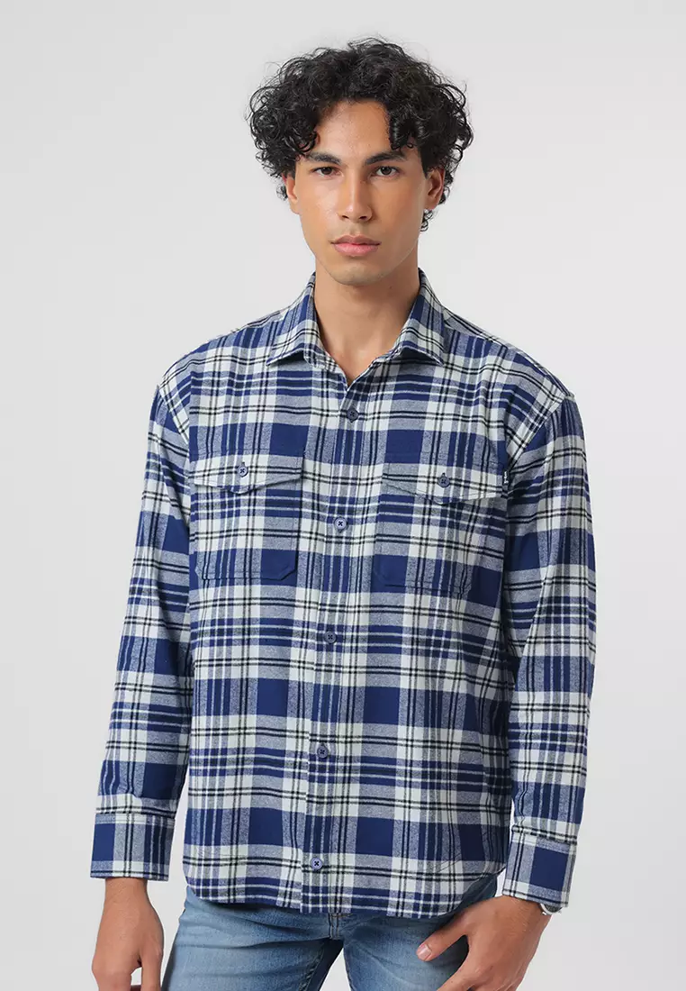 MELVINS - NAVY Kemeja Flannel Pria Motif Kotak-Kotak Lengan Panjang Relaxed Fit