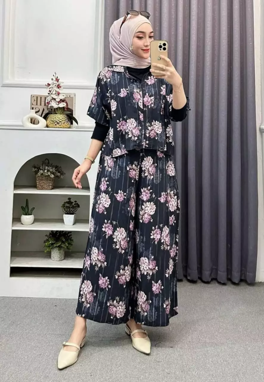 Setelan Kulot Crop Jumbo Hitam Bunga Ungu Premium Modern MYA