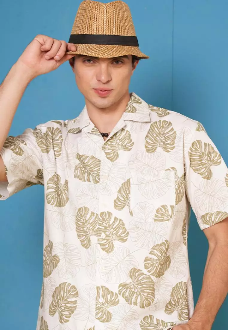 Kemeja Ethan White Lengan Pendek Hawaiian Rouffe Leaf