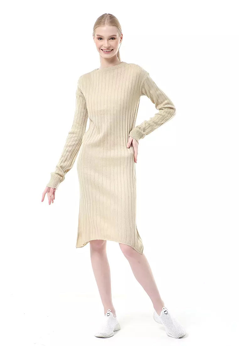 Adela Dress Rajut Tunik Wanita Motif Polos Long Sleeve Relaxed Fit - Cream
