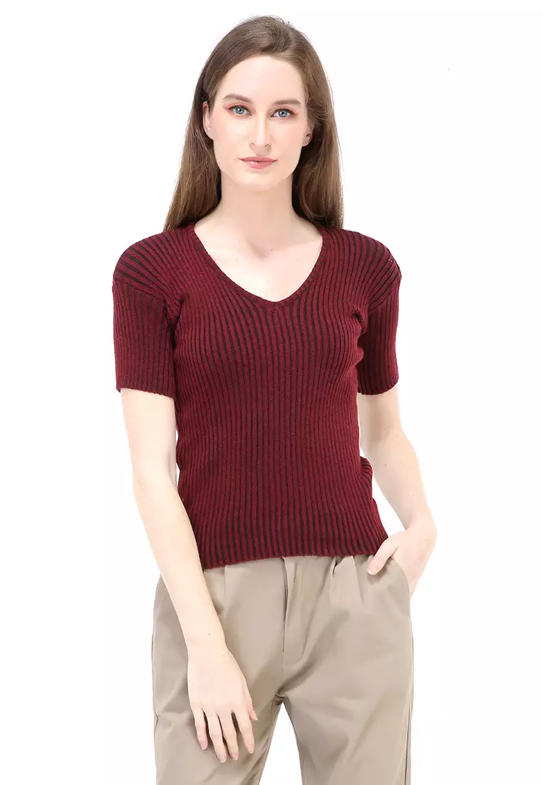 Amora Vneck Rajut Short Sleeves Atasan Casual Wanita - Maroon