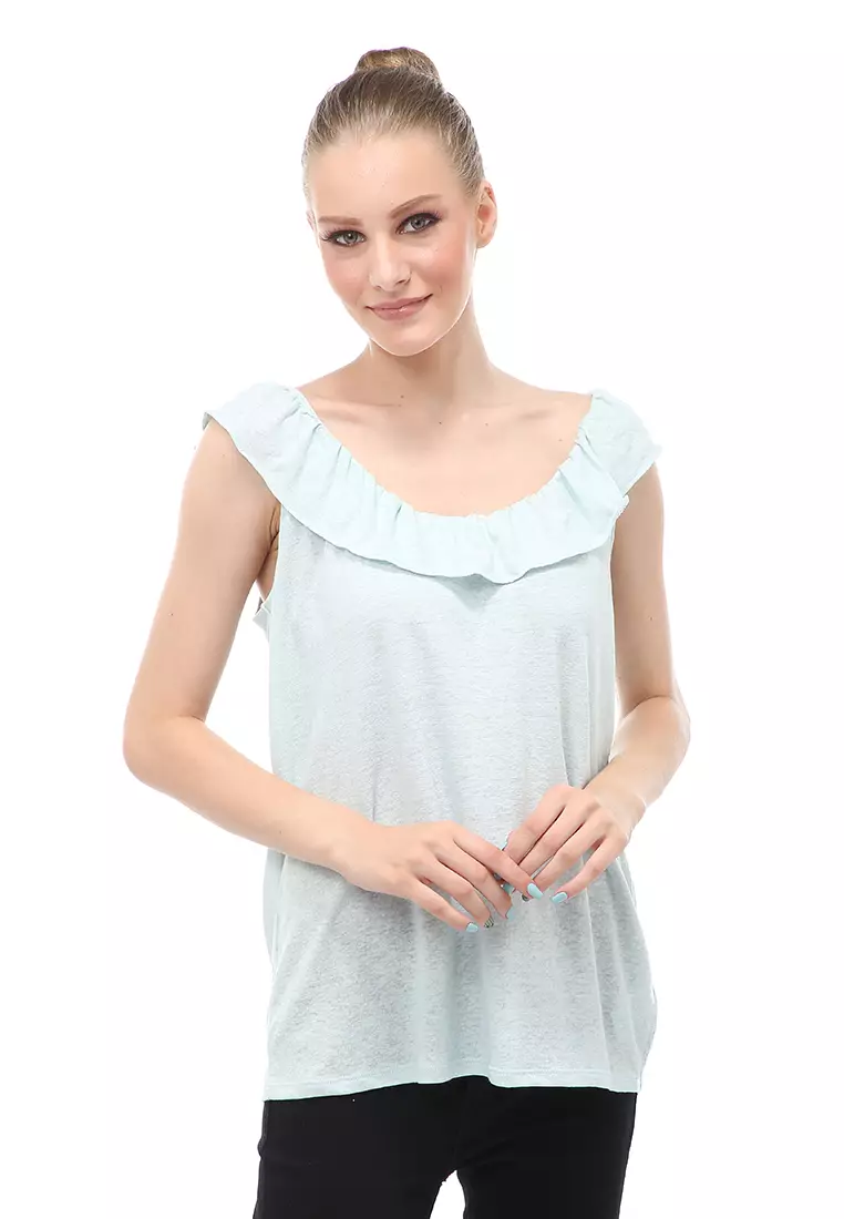 Baju Atasan Ruffled Linen Blend Jersey Wanita Relaxed Fit - Light Tosca