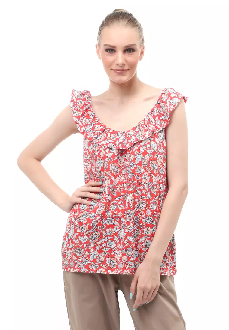 Baju Atasan Ruffled Linen Blend Jersey Wanita Relaxed Fit - Orange Floral