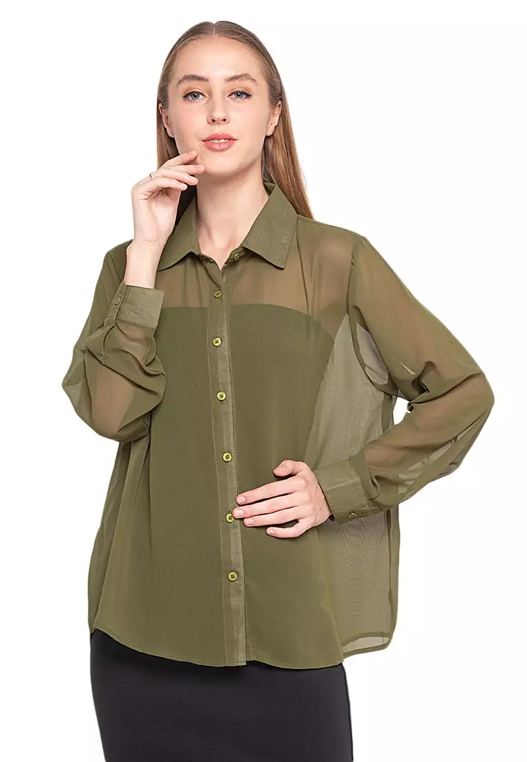Calder Kemeja Atasan Transparan Front Button Opening Design Simple Plain Shirt Wanita - Green