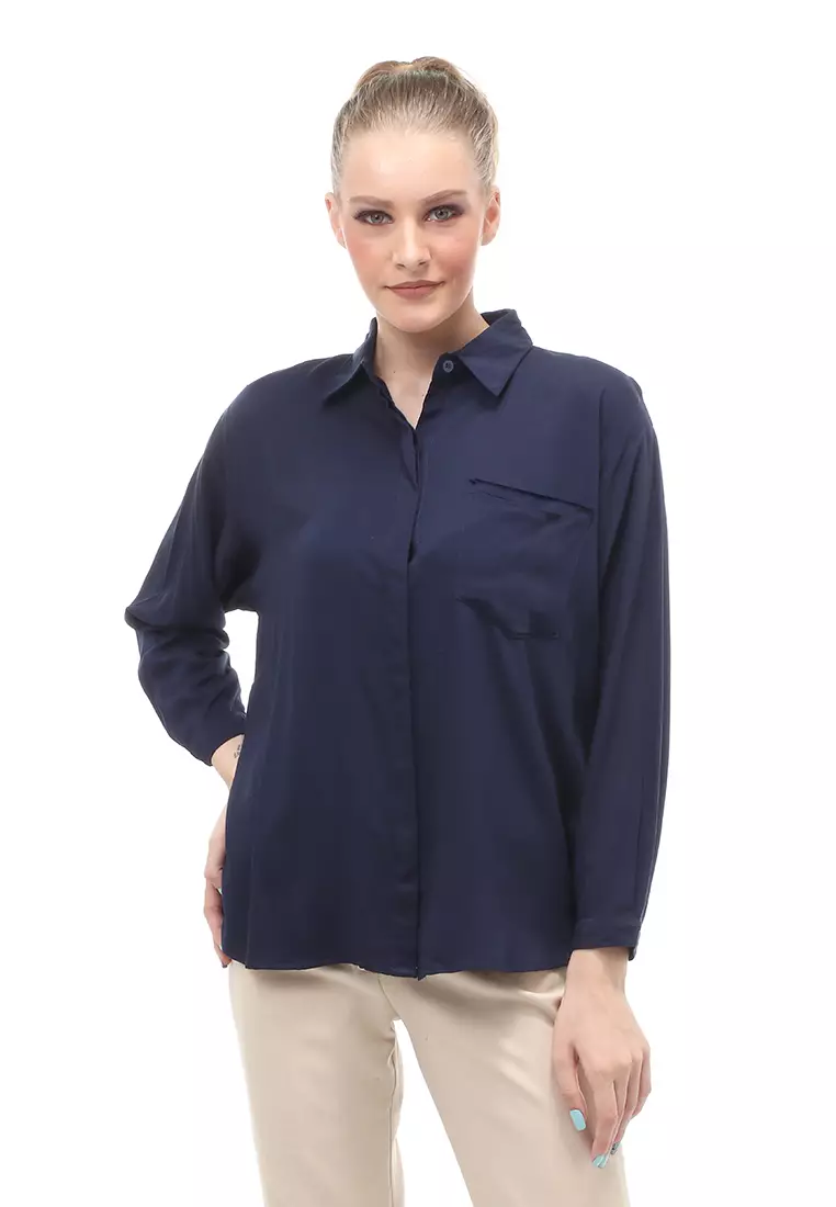 Dean Basic Shirt Lengan Panjang Atasan Wanita Front Button Opening Relaxed Fit - Navy