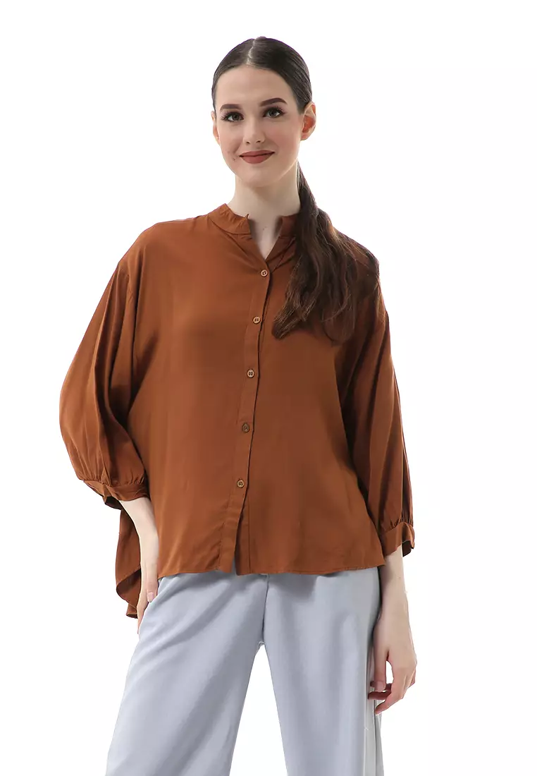 Ghita Kemeja Atasan Wanita Motif Polos Long Sleeve High Quality - Caramel