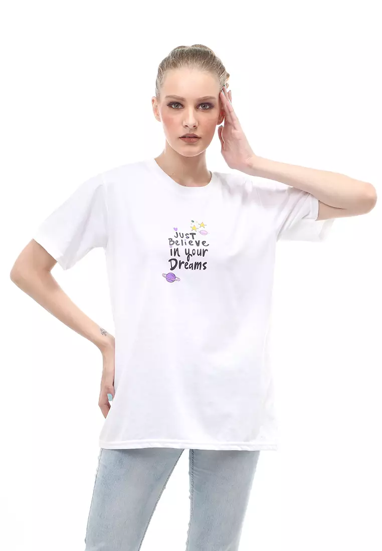 Heller Kaos Atasan Wanita Oversize Motif Print Short Sleeves Relaxed Fit - Lepen Putih