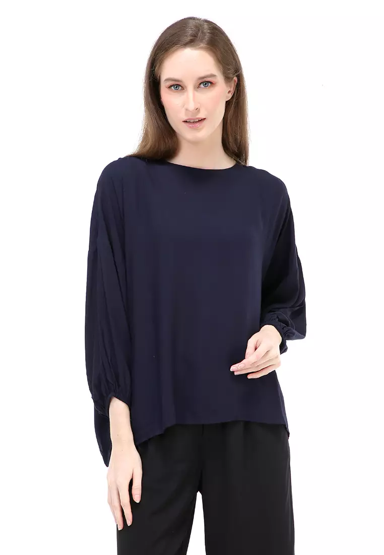 Jennifer Blouse Long Sleeves Wanita Motif Polos Atasan Casual - Navy