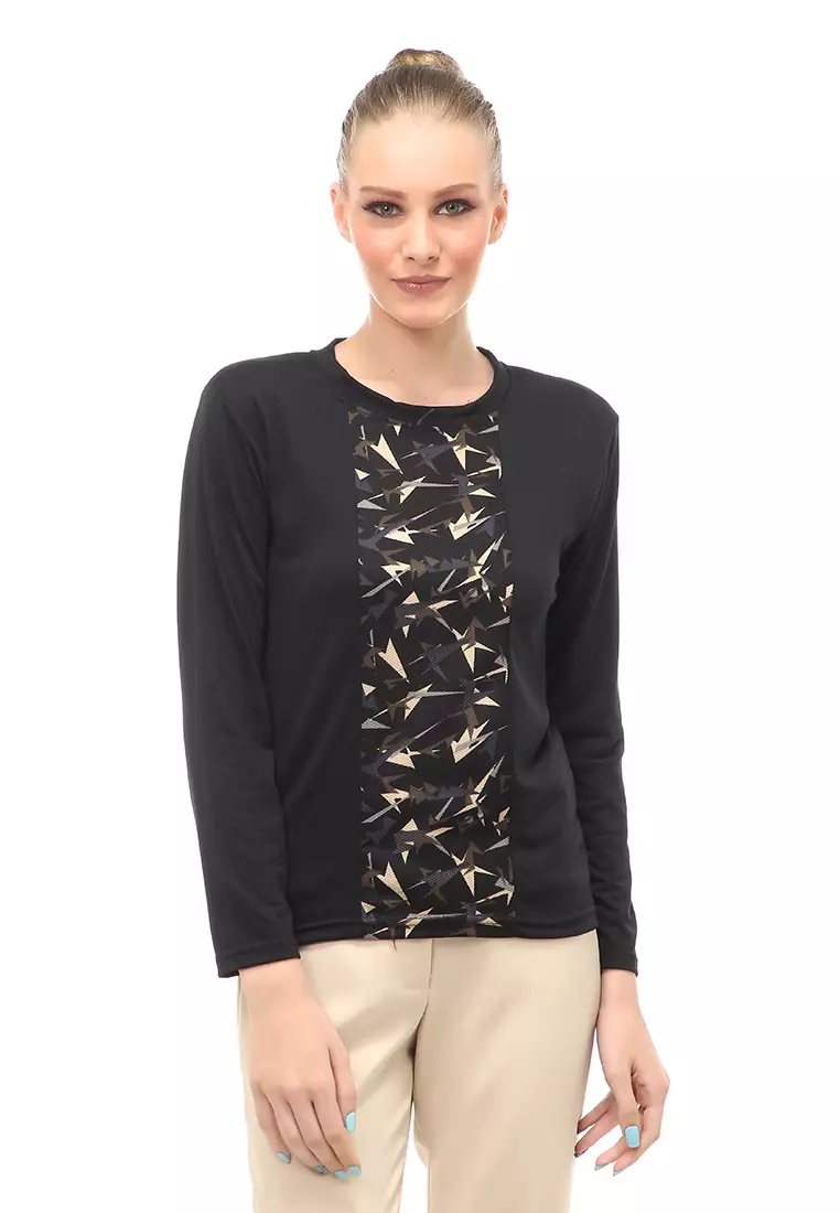 Kaos Atasan Wanita Long Sleeves Detail Motif Abstrak Slip On Style - Hitam