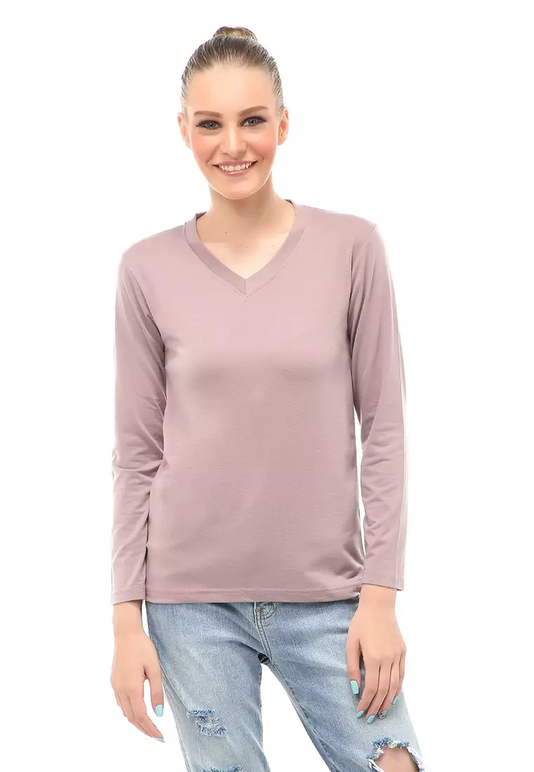 Kaos Polos Atasan Wanita V-Neck Lengan Panjang Design Simple Relaxed Fit - Mocca
