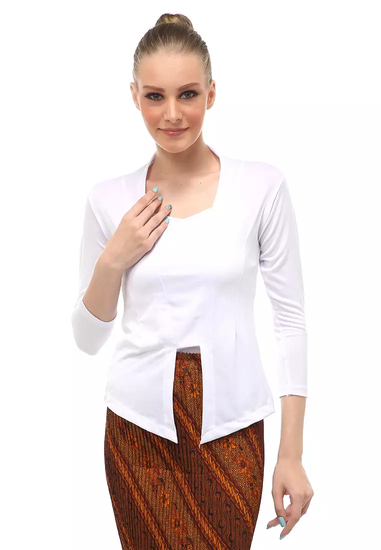 Kebaya Atasan Wanita Motif Solid Long Sleeves Slip On Style Design Casual Relaxed Fit - Putih