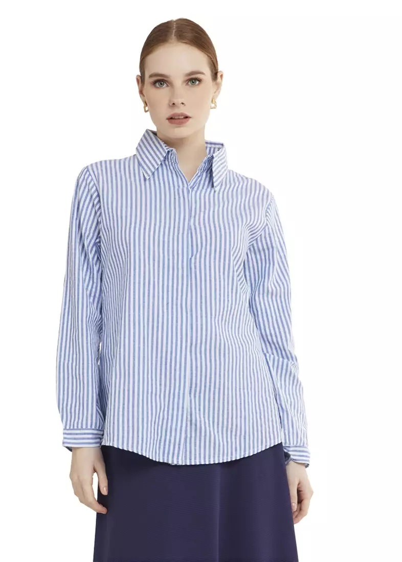 Kemeja Salur Basic Lengan Panjang Garis Shirt Wanita - Blue