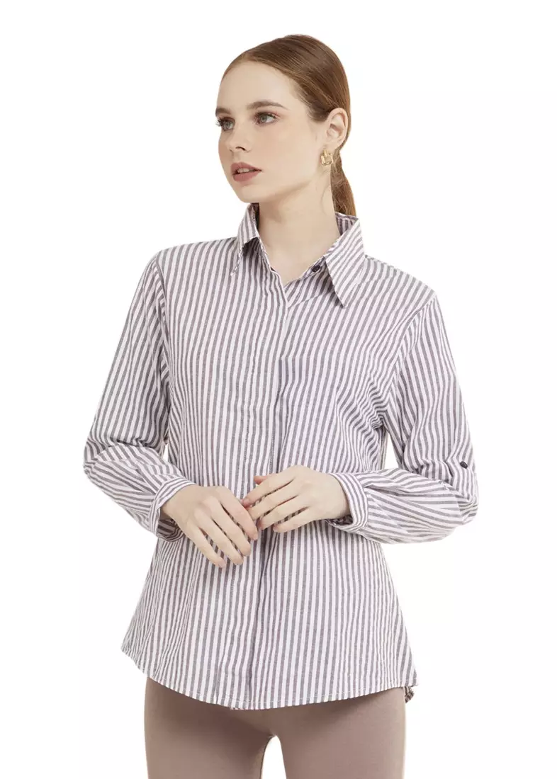 Kemeja Salur Basic Lengan Panjang Garis Shirt Wanita - Coklat