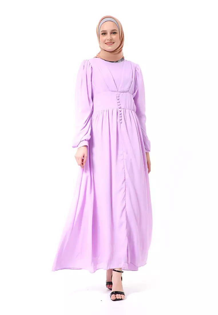 Khansa Long Dress Muslimah Atasan Wanita Long Sleeve Motif Polos High Quality - Ungu Muda