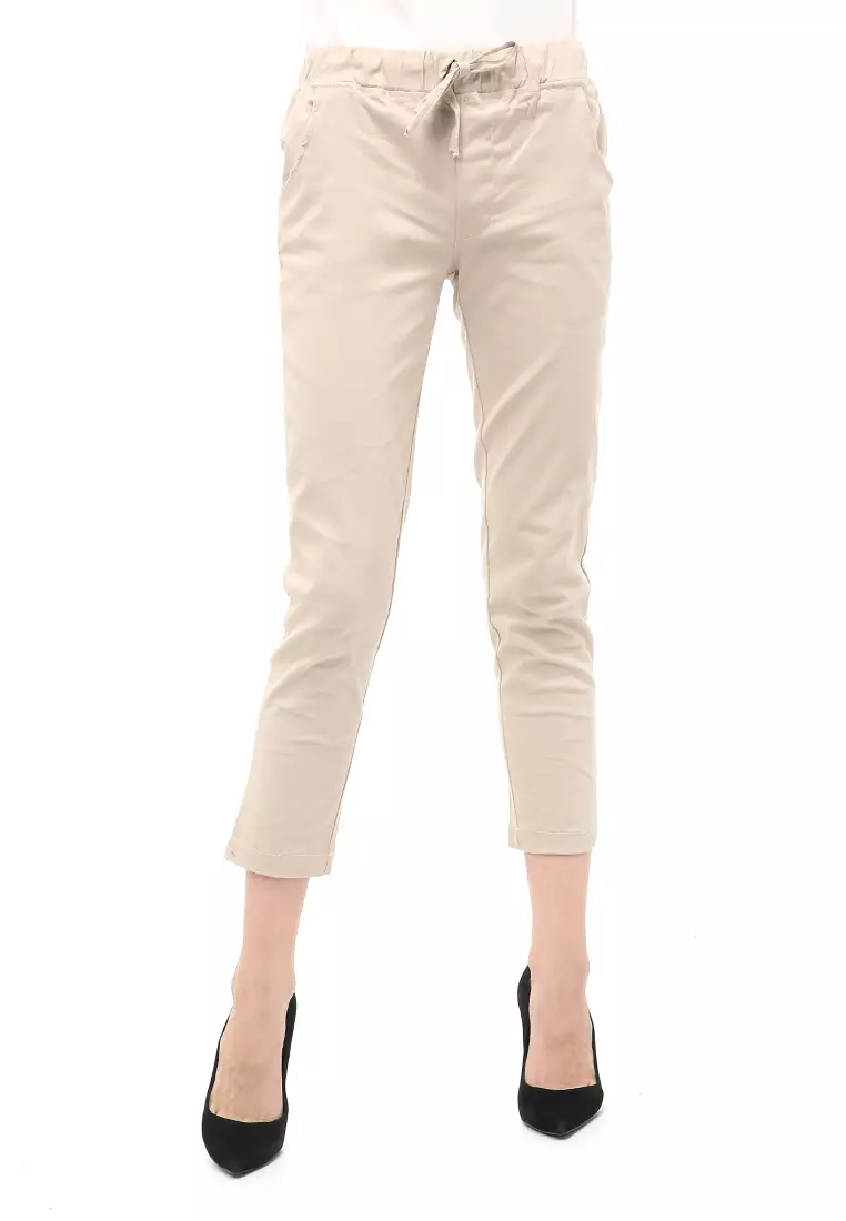 Long Pants Wanita Motif Solid Rubbery Waist Design Casual Regular Fit - Cream