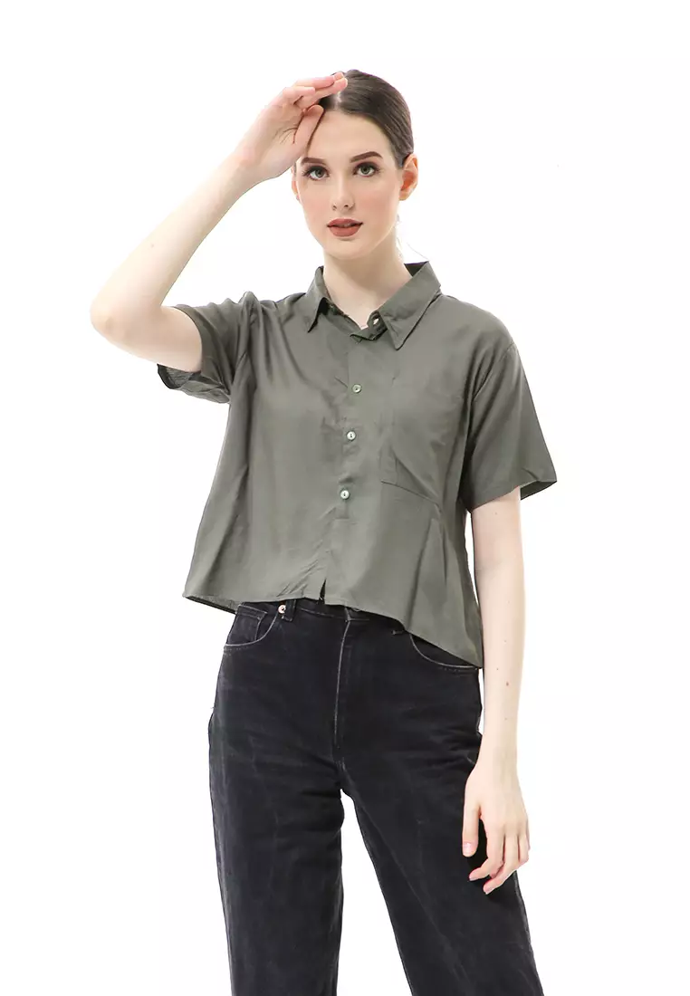 Melinda Kemeja Crop Top Atasan Wanita Motif Polos Relaxed Fit - Army