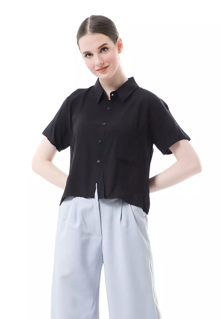 Melinda Kemeja Crop Top Atasan Wanita Motif Polos Relaxed Fit - Hitam