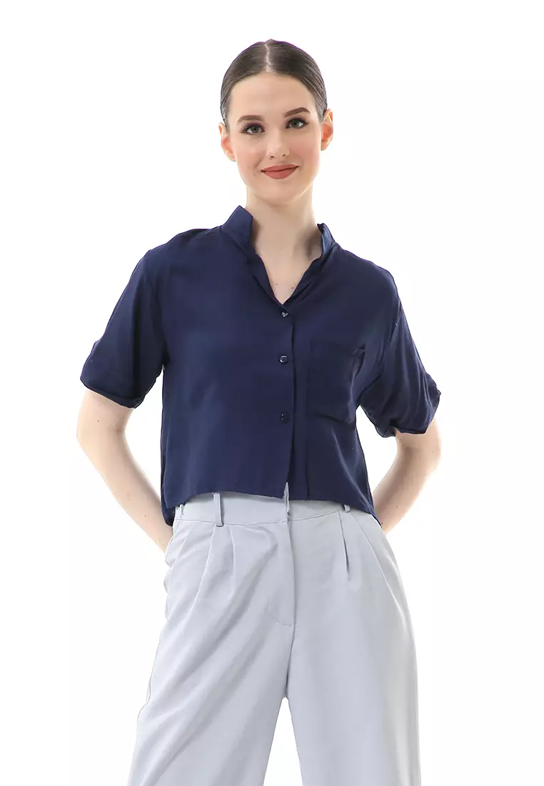 Melinda Kemeja Crop Top Atasan Wanita Motif Polos Relaxed Fit - Navy