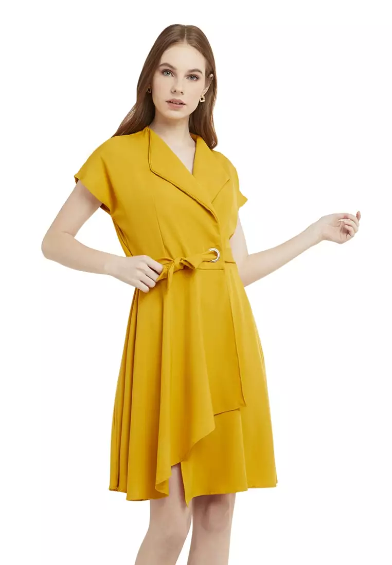 Mini Dress Kasual Lengan Pendek Collar Neckline Baju Wanita Regular Fit - Mustard